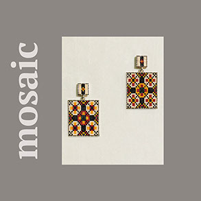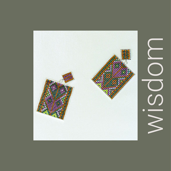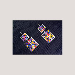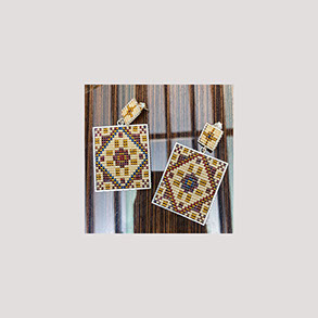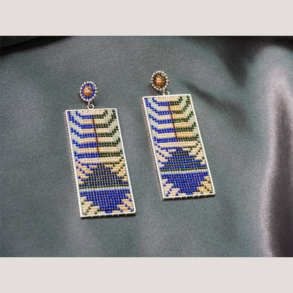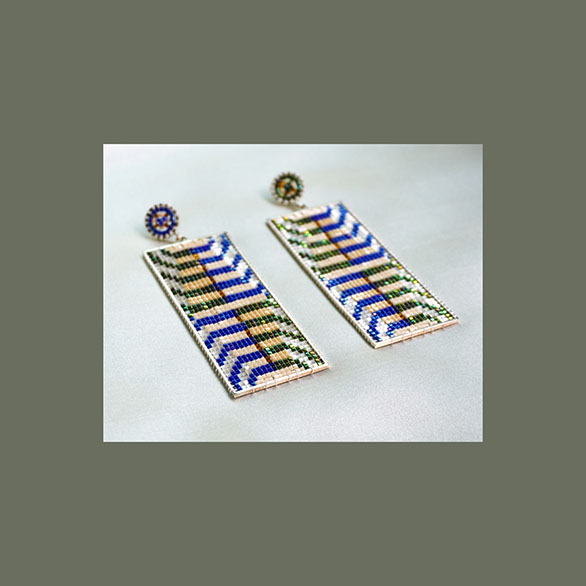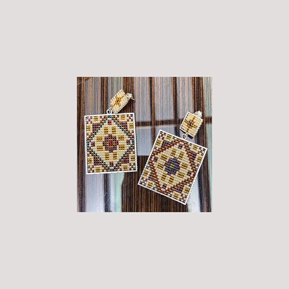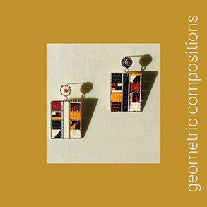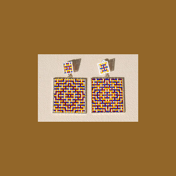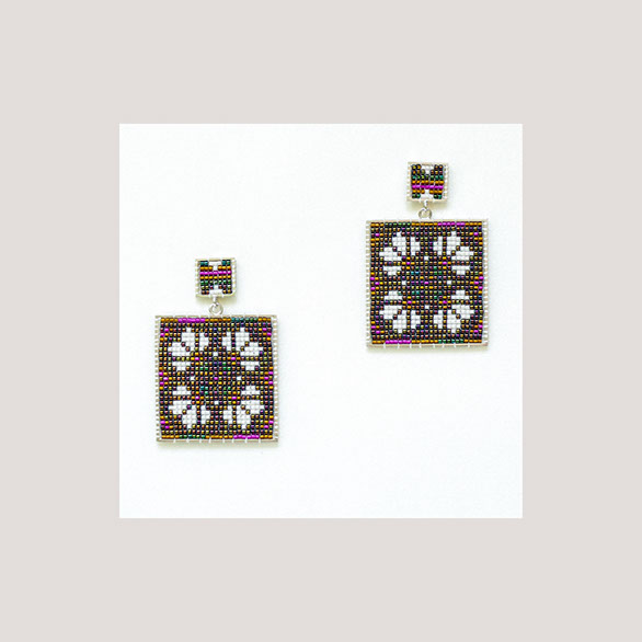 .925 sterling silver structure with .925 sterling silver stud and ear nuts. Waxed nylon thread, glass and metal beads.