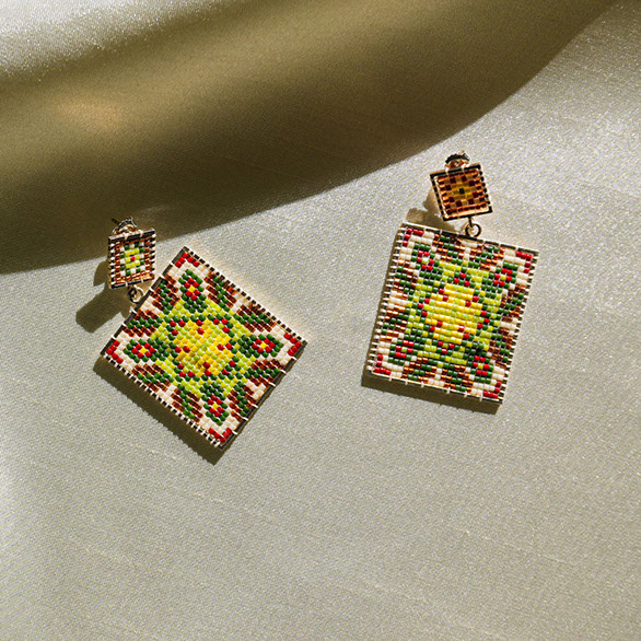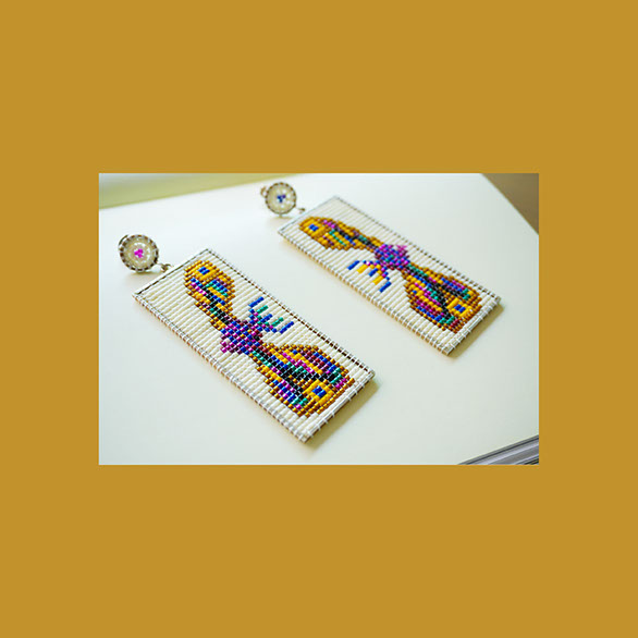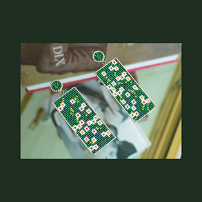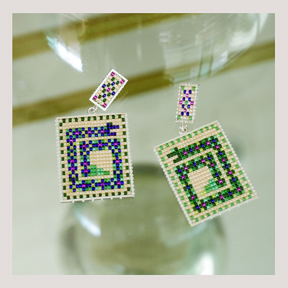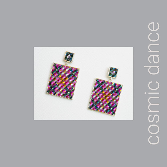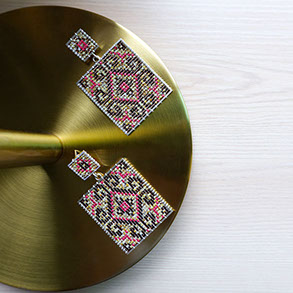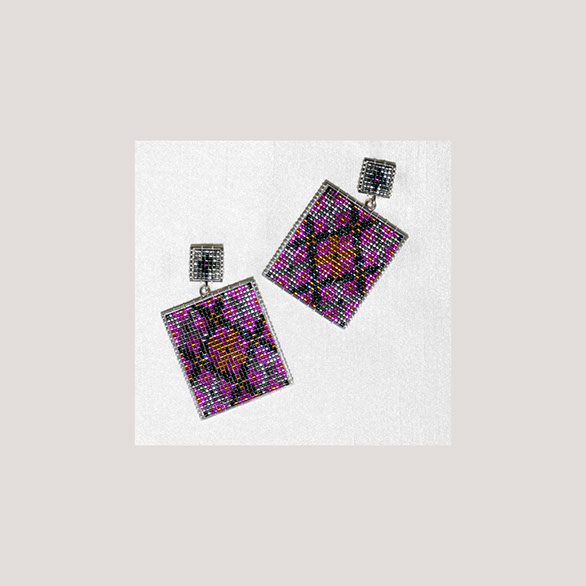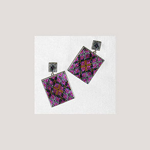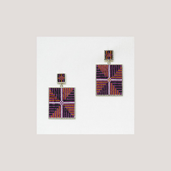 .925 sterling silver structure with .925 sterling silver stud and ear nuts. Waxed nylon thread, glass and metal beads.