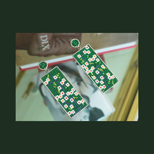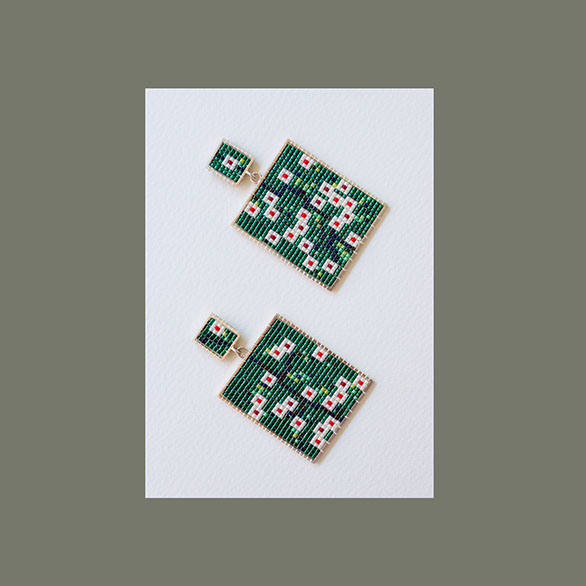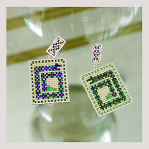 Estructura en plata de ley .925 con poste y broche de plata de ley .925 Hilo de nylon encerado, cuentas de cristal y metal.
